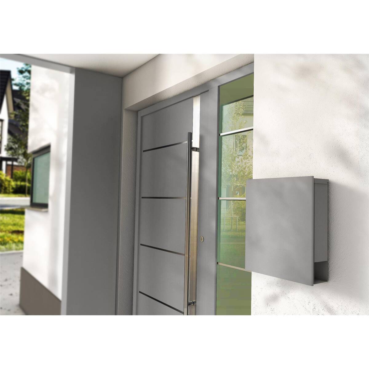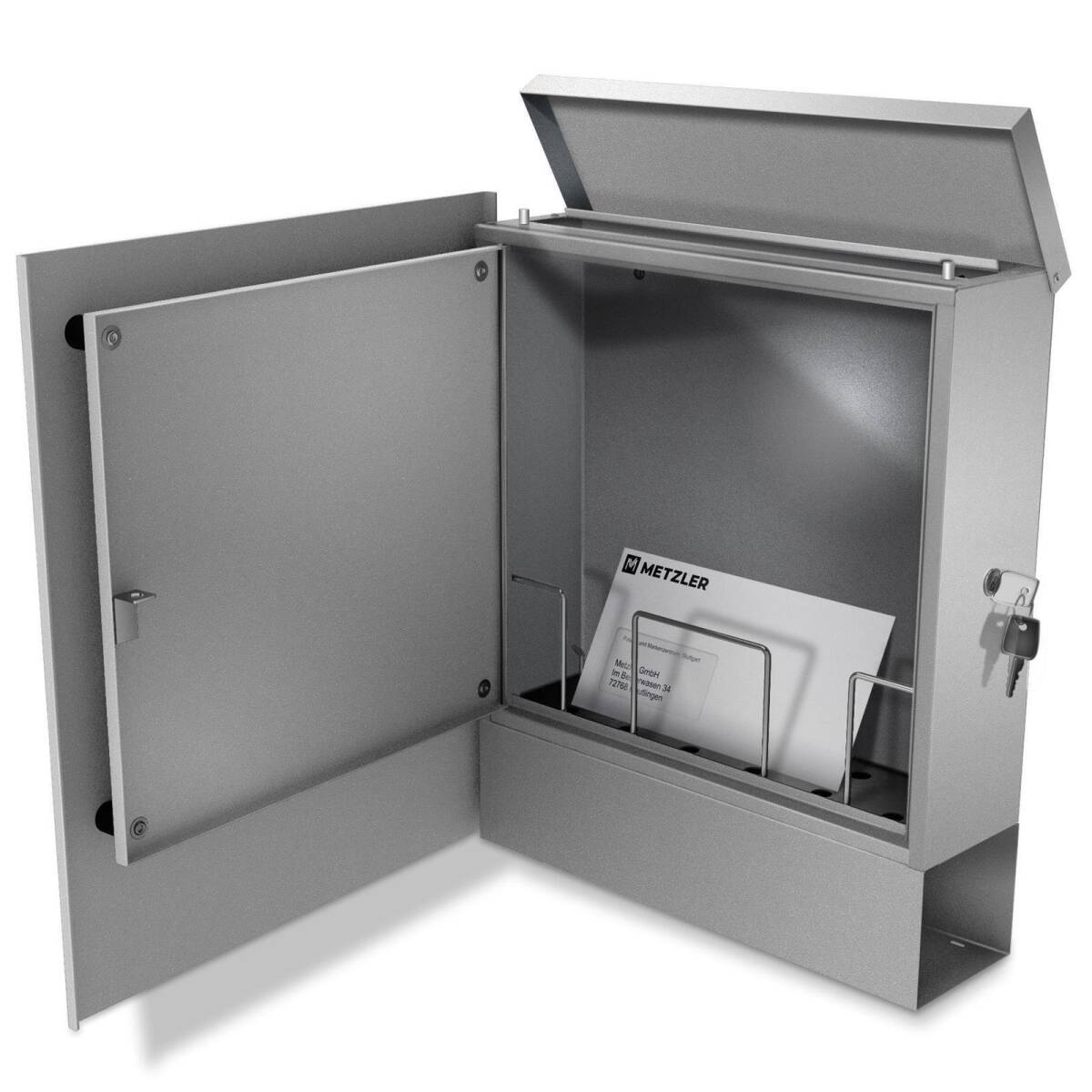 Der Metzler Briefkasten "LEPO" vereint hochwertige Materialien, durchdachte Funktionalität und exklusives Design. Gefertigt aus massivem, pulverbeschichtetem Stahl, bietet er eine robuste und witterungsbeständige Lösung für Ihren Eingangsbereich. Das schlichte, geradlinige Design fügt sich harmonisch in jede Umgebung ein und wird garantiert zum Blickfang. Dank der großzügigen Einwurfklappe ist der Briefkasten "LEPO" auch für DIN A4 Umschläge geeignet. Ein vollintegriertes, beidseitig befüllbares Zeitungsfach sorgt dafür, dass auch Ihre Zeitungen stets ordentlich und geschützt aufbewahrt werden. Die einfache Briefentnahme wird durch das integrierte Postfang-System erleichtert, während die wählbare Montageseite des Schlosses zusätzlichen Komfort bietet. Der Briefkasten ist mit Gummipuffern ausgestattet, die das Zuschlagen der Klappe geräuschlos machen. Durch das verdeckte Einwurfloch bleibt Ihre Post jederzeit trocken. Mit einer praktischen Größe von 355 x 435 x 100 mm und einem Einwurfschlitz von 330 x 30 mm ist der Briefkasten perfekt für den täglichen Gebrauch. Zwei Schlüssel und das notwendige Befestigungsmaterial für die Wandmontage sind im Lieferumfang enthalten. Qualität bis ins kleinste Detail – der perfekte Briefkasten für jedes Zuhause.